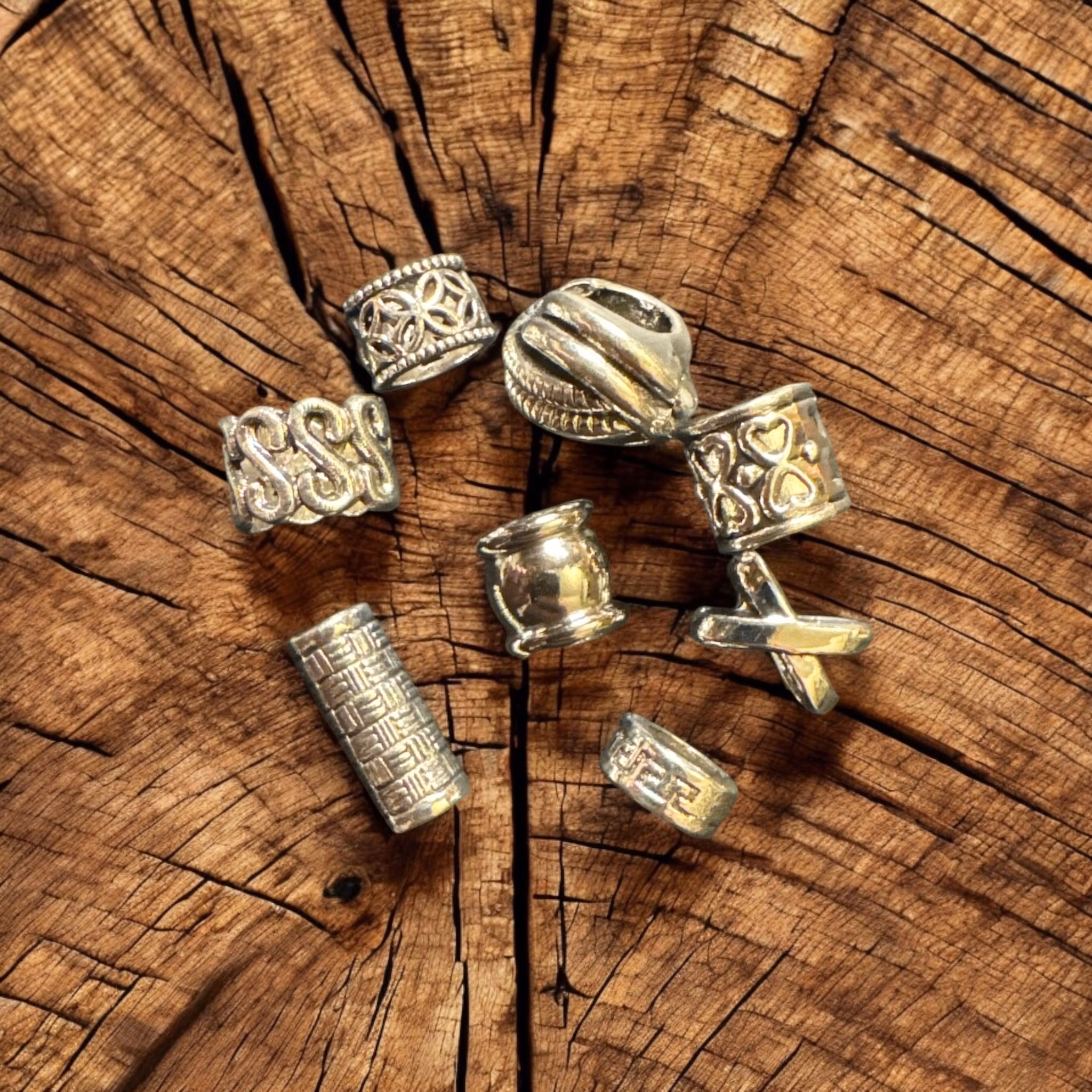 En mix av rustika pärlor i silverlegerad metall för dina dreadlocks.
